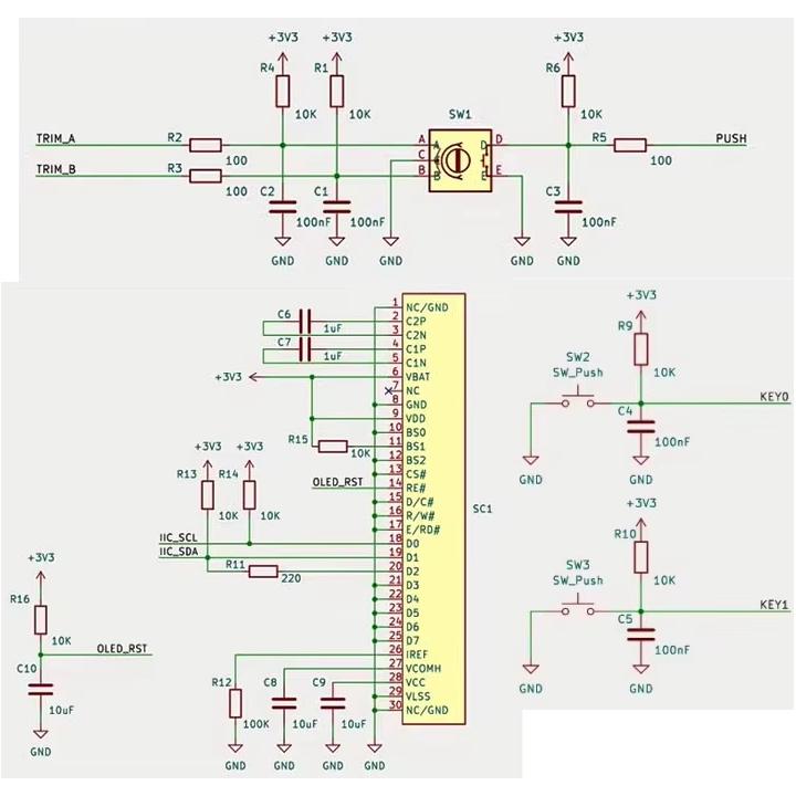 Ez a modul egy 1.3″-os SH1106/SH1116 vezérlővel működő 128×64 pixeles fehér kijelzőt tartalmaz, amire egy EC11-es inkrementális jeladót (rotary encoder) és két mikrokapcsolót építettek. Így egy kompakt rendszerben kezelhető, navigációs menüvel ellátható kijelzővel tudjuk felszerelni mikrokontrollerünket.