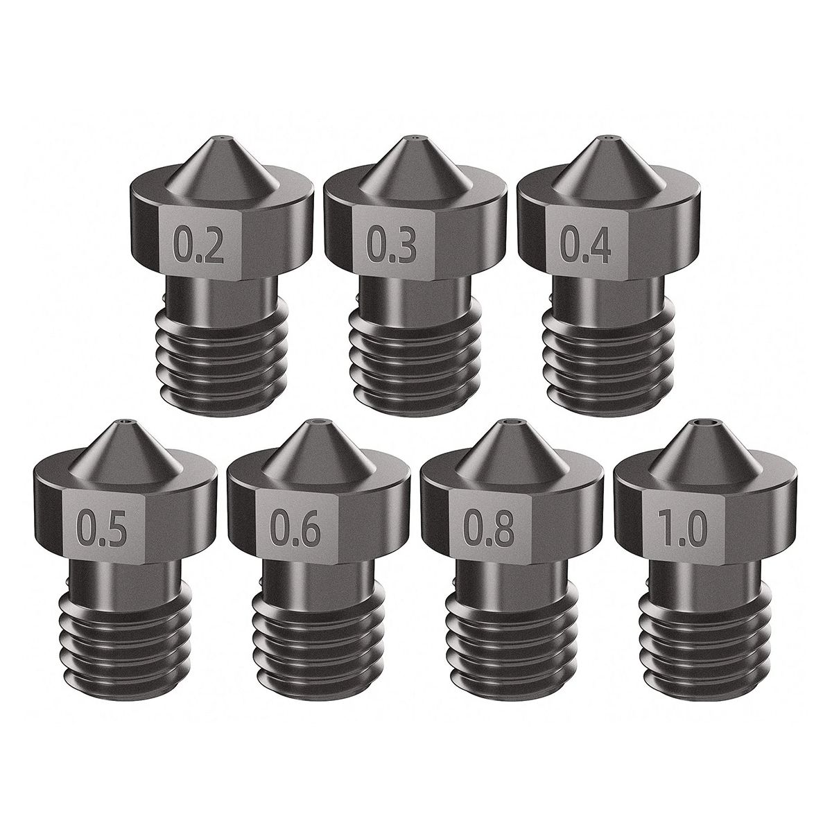 E3D V5 és V6 fejekhez, vagy más, M6-os menettel rendelkező 3D nyomtatófejhez használható fúvókák különböző átmérővel.