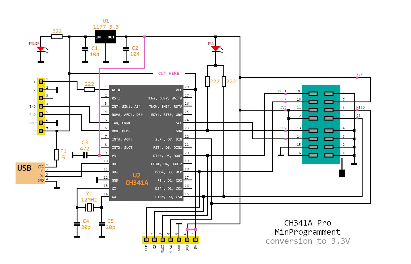 Az IC foglalat melletti sárga tüskesorra kivezetve az áramkör sima USB-TTL soros átalakítóként is használható, pl. mikrokontrolleres fejlesztő modulra csatlakoztatva. Ehhez a tüskesor 1-2 lábai közötti jumpert a 2-3 közzé kell dugni. Windows 10-es driver: CH341SER.zip