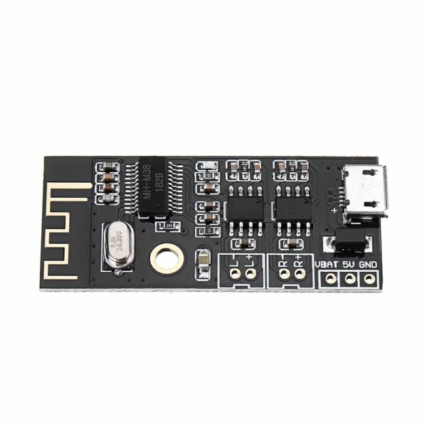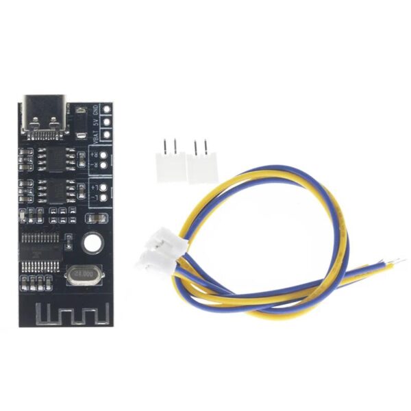 Kis bluetooth 4.2 modul audio vételre. A panel tartalmaz 2 db D osztályú erősítő IC-t, amik 2 Ω terhelésen akár 5W-ot is ki tudnak adni, normális minőségben 4 Ω -on inkább csak 3 W-ot. 2.54 mm lábtávolságú forrszemeibe tüskesorok forraszthatóak, vagy a kimenetekre a mellékelt JST aljzatok, amikre szintén mellékelt kábeldarabokkal lehet csatlakozni. MicroUSB aljzatán tápfeszültséget kaphat. Bluetooth kapcsolódáskor és leválasztáskor egy-egy rövíd csippanás hallatszik a hangszóróból.